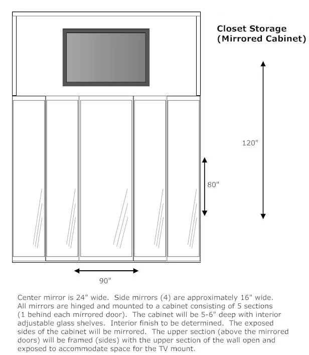 This is a built-in cabinet that I designed for a client's closet. The cabinet is large and features full length door mirrors.